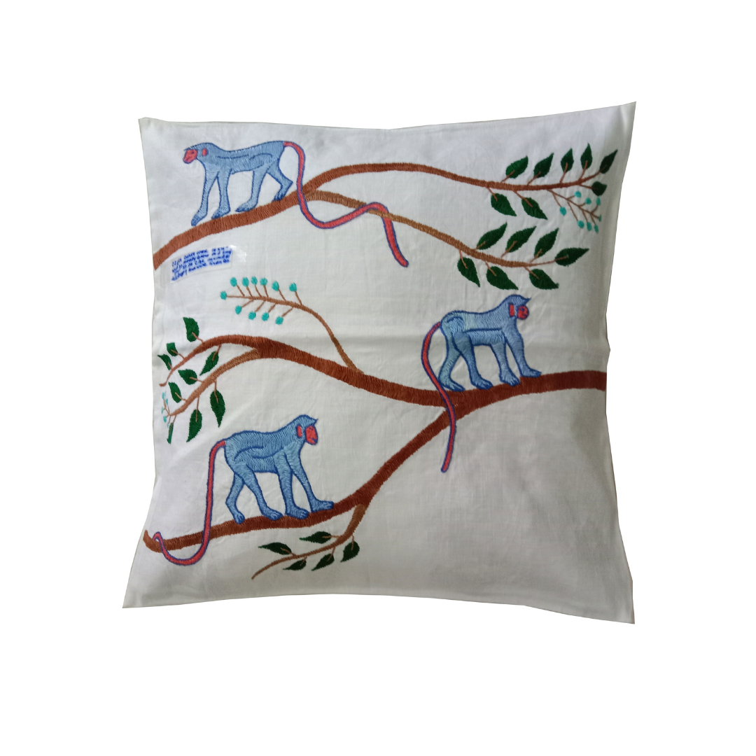 White Base Three Monkeys on the Tree Branch design Cushion Cover.