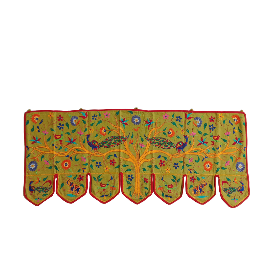 Green base, Elephant & Peacock with kalamkari design Embroidery Door Hanging.