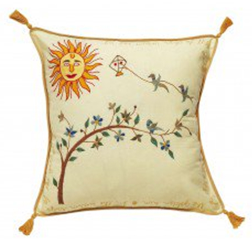 This hand-embroidered sun pillow will bring joy and warmth to a room. Lovingly stitched by the artisans of St. Mary’s Mahila Shikshan Kendra.