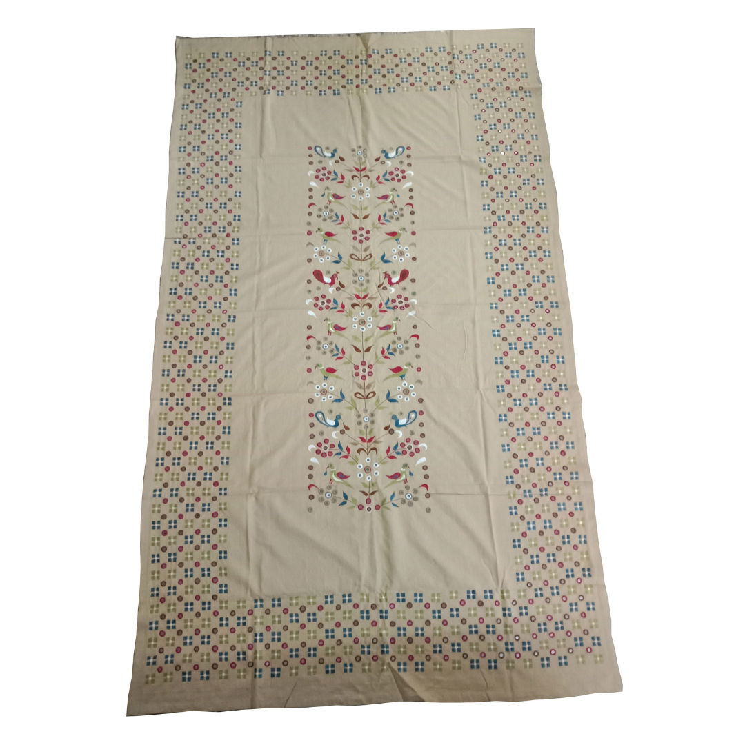On Biscuit colour Base with Blue, Green, & Brown coloured embroidery Design work Table Cloth.